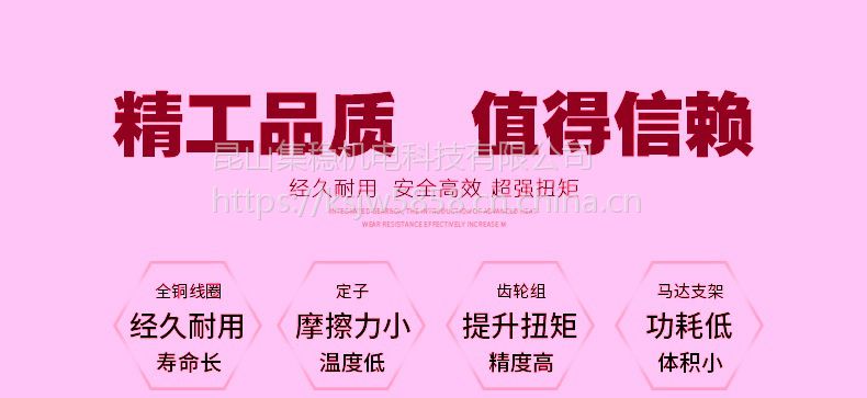 昆山集稳机电科技有限公司是一家专业生产销售微型、小型交流电动机、直流电动机、感应电动机、减速电机、调速电机、可逆电机(正反转电机)、光轴电机、阻尼电机、力矩电机、刹车电机和开门电机的企业,产品具有外形美、噪音低、寿命长等特点,通过CCC和CE认证,产品有AC系列:6W、15W、25W、40W、60W、90W、120W、140W、180W、200W、750W、1500W、2200W;DC系列:6W、10W、15W、20W、25W、30W、40W、60W、90W、120W、200W、300W。齿轮箱减速比有:1:3—1:750等多个品种。